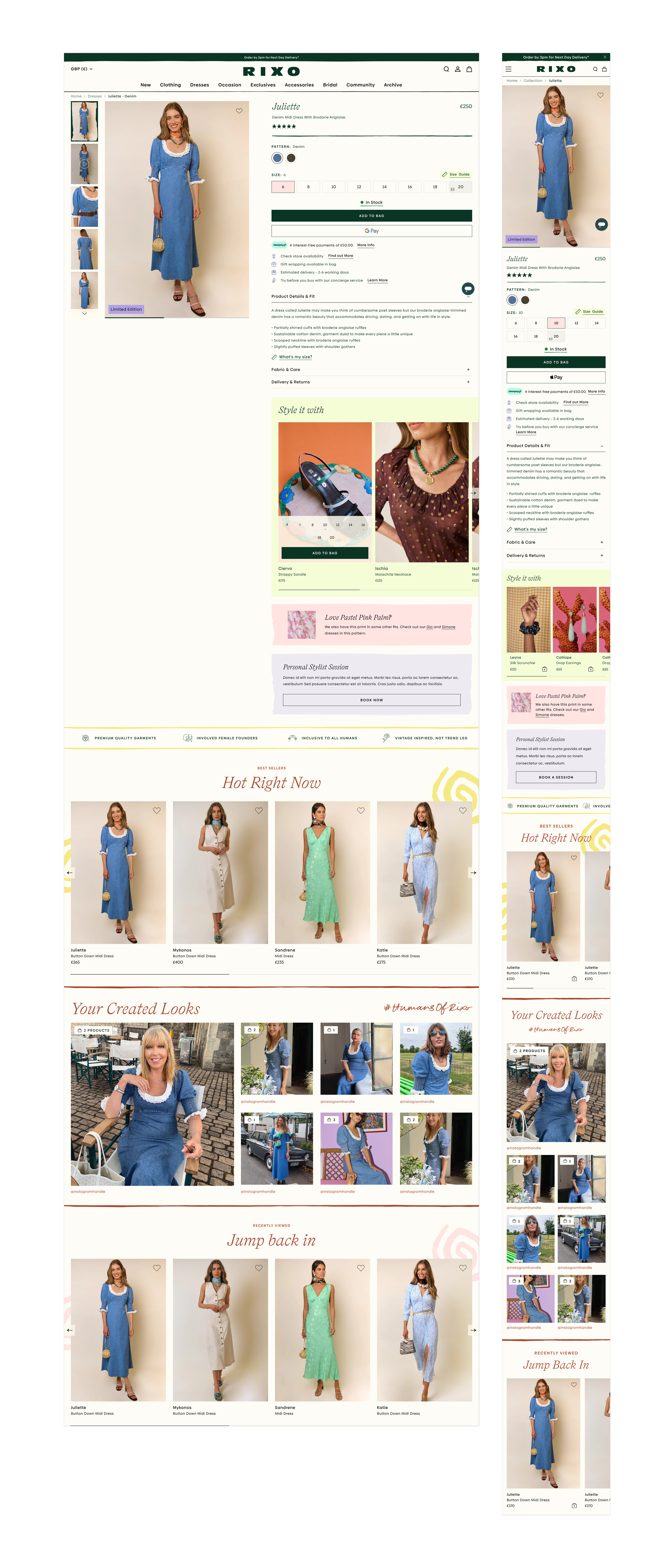 In an effort to tackle bounce rates I was tasked with redesigning the PDP on the website. The main goal for this was to declutter the design so the customer could focus on the product. Firstly I created a new set of typography brand guidelines to rebalance the hierarchy, we then added additional functionalities to help clean up the design, so the customer could focus on the product and the information that she needs. Creating a horizontal scroll we were able to save space and add in important information that she expects to see such as the models size information. We wanted to keep the branded colours and motifs but in a more intentional way without distracting the customer.